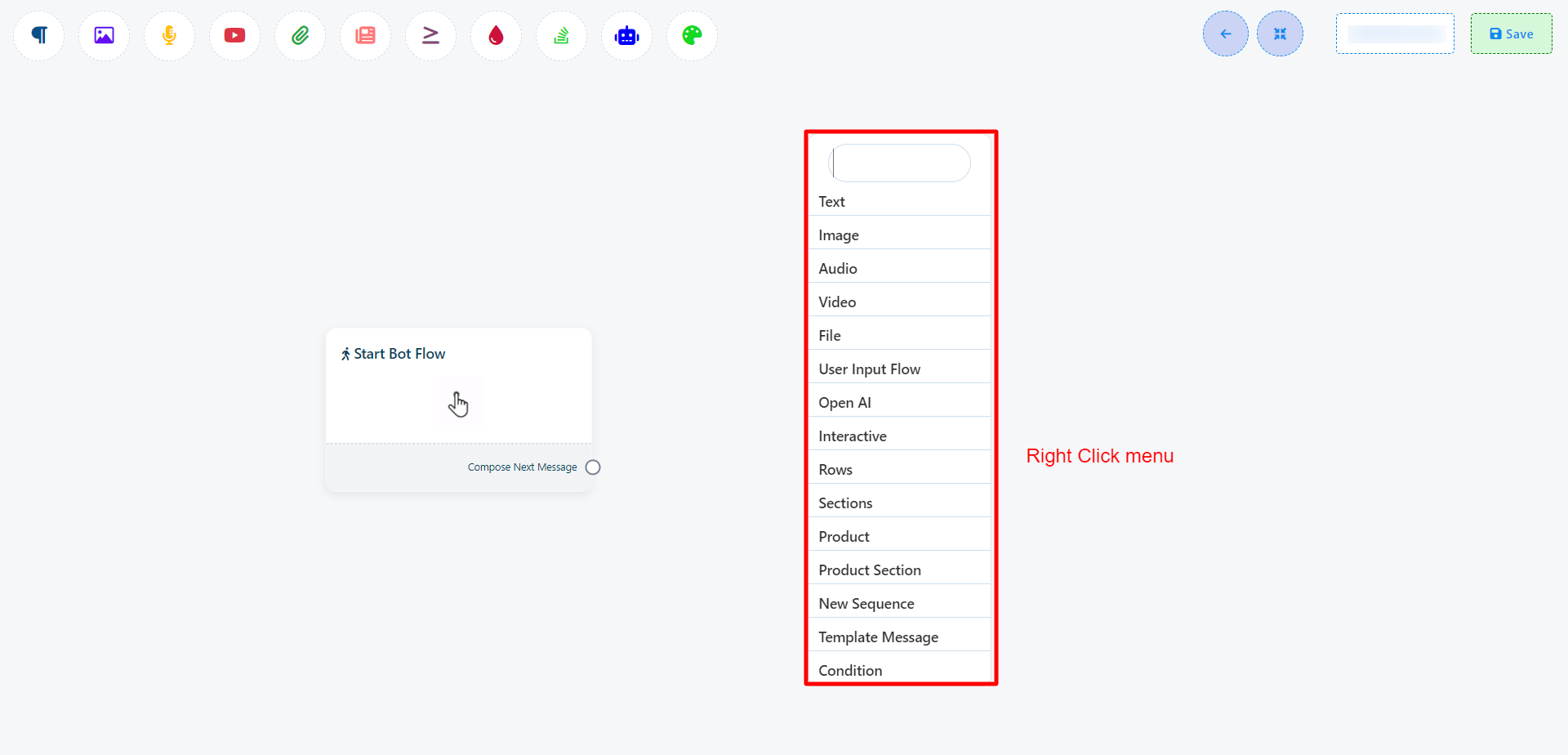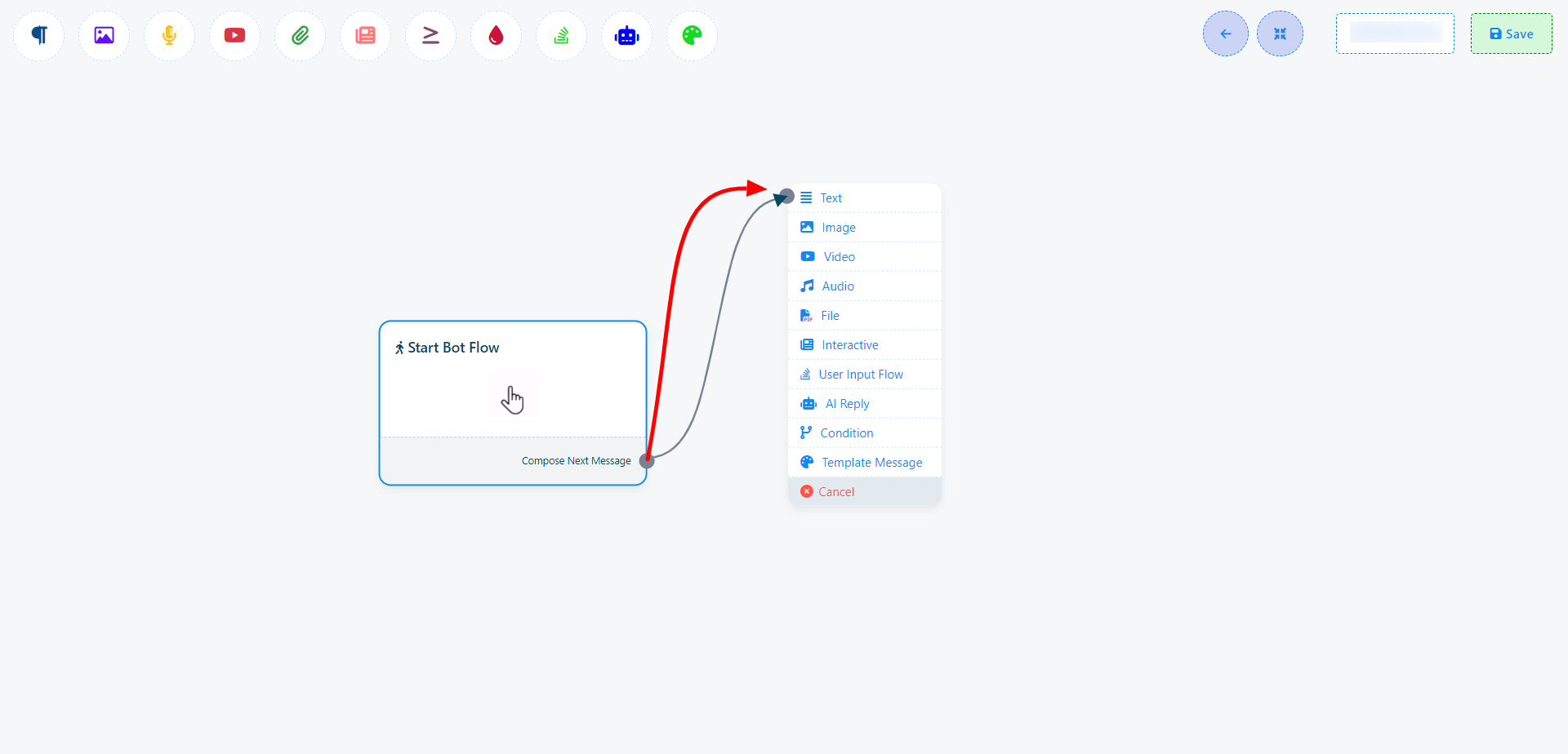 16. Once you`ve completed the `Start Bot Flow` setup, you`ll encounter a sockets: `Compose Next Message`, These sockets allow you to add various components and configure them.