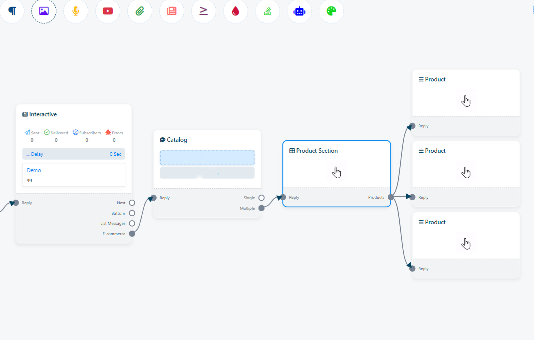 1. Add `Interactive` and Right-click on E-commerce socket and drag your mouse into the flow builder. This action will make the `Catalog` element appear.